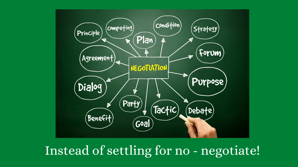 - Know when to make offers and counteroffers – In both my scenarios, understanding the parameters of others was necessary so we could make compromises. Be open to suggestions;p know what you are and aren’t prepared to give up.