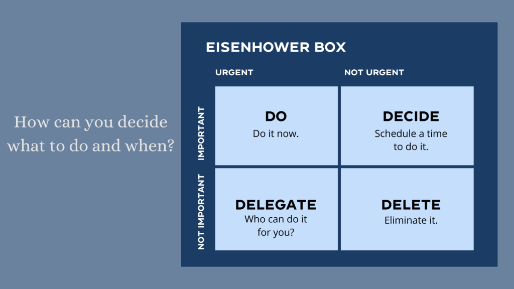 Another way to determine what to do first and what to next is to use the Eisenhower Box or Eisenhower Matrix, named for US President Dwight Eisenhower. It’s an excellent guide for helping you making the decisions on what to do first, next, and so on.