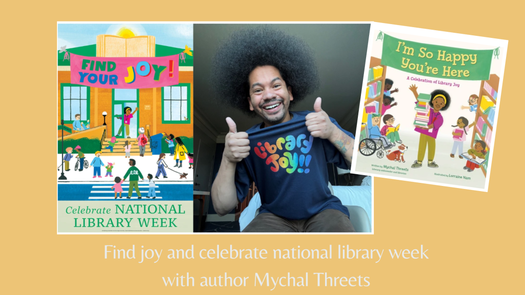 It’s National Library Week and the theme is FIND YOUR JOY embodied so wonderfully by “The Internet Librarian” and children’s book author Mychal Threets (and expressed in his book I’m So Happy You’re Here – A Celebration of Library Joy.). In recognition of his joyful advocacy and dedication to library life, Mychal has been honored with numerous awards: the 2024 I Love My Librarian Award from the American Library Association, inclusion in School Library Journal’s 2024 Movers and Shakers, TIME Magazine’s 2024 Next Generation Leaders, a 2024 Webby Award for Social Impact, and a spot on TIME’s inaugural 2025 list of 100 Creators.