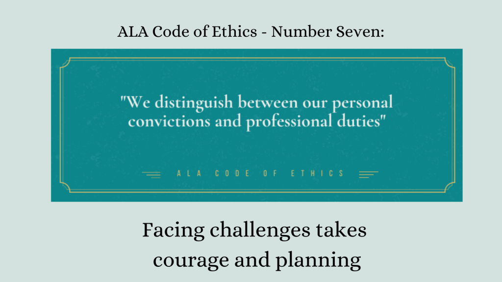 Number 7 reads: “We distinguish between our personal convictions and professional duties and do not allow our personal beliefs to interfere with fair representation of the aims of our institutions or the provision of access to their information resources.”
